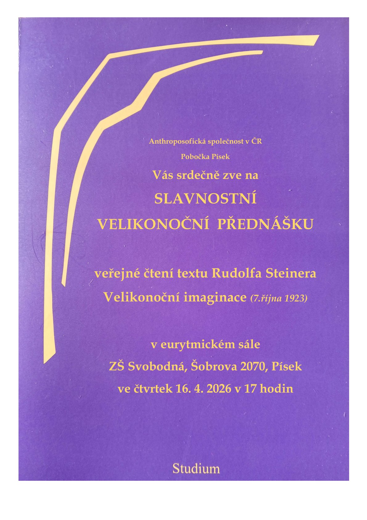 Propojení pohybu těla a našeho myšlení. Otevřeno všem zájemcům. Ve studiu budeme pokračovat v textu Rudolfa Steinera Od Ježíše ke Kristu. V eurytmii se budeme věnovat Základnímu kameni.